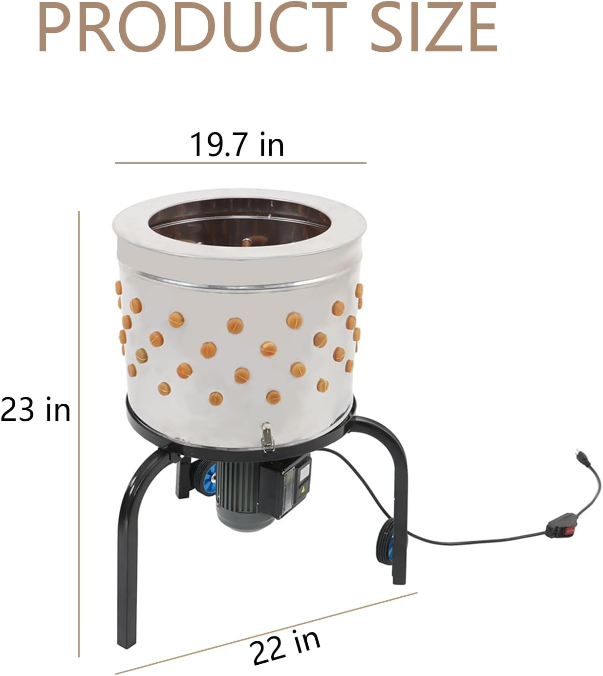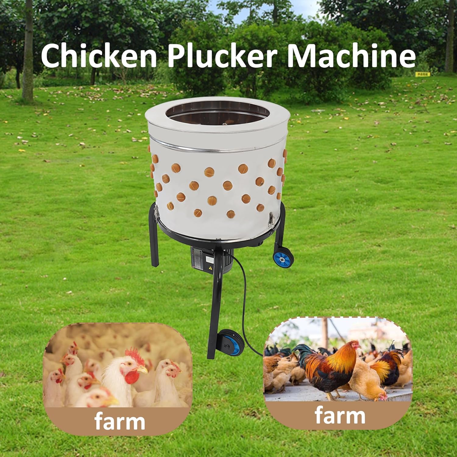 The feather plucking machine bucket has a diameter of nearly 19.7 inch and can hold nearly 2-3 chickens at a time, with transport wheels on the bottom for easy transport, making it a great addition to the farm.